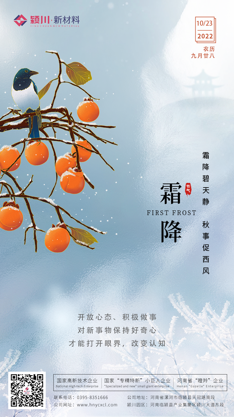 ┍霜┑ 好柿成霜 秋高气爽┕降┙ 喜从天降 春华秋实开放心态、积极做事,对新事物保持好奇心。——#颍川新材料:0395-8351666